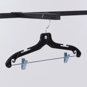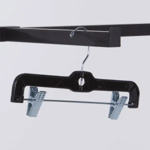 Cintre muni d’une barre horizontale avec pinces réglables et d’un crochet pivotant en métal. Boîte de 100