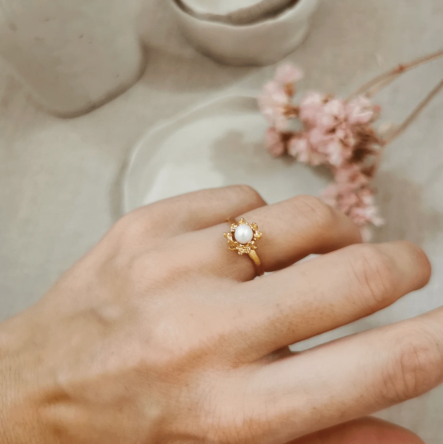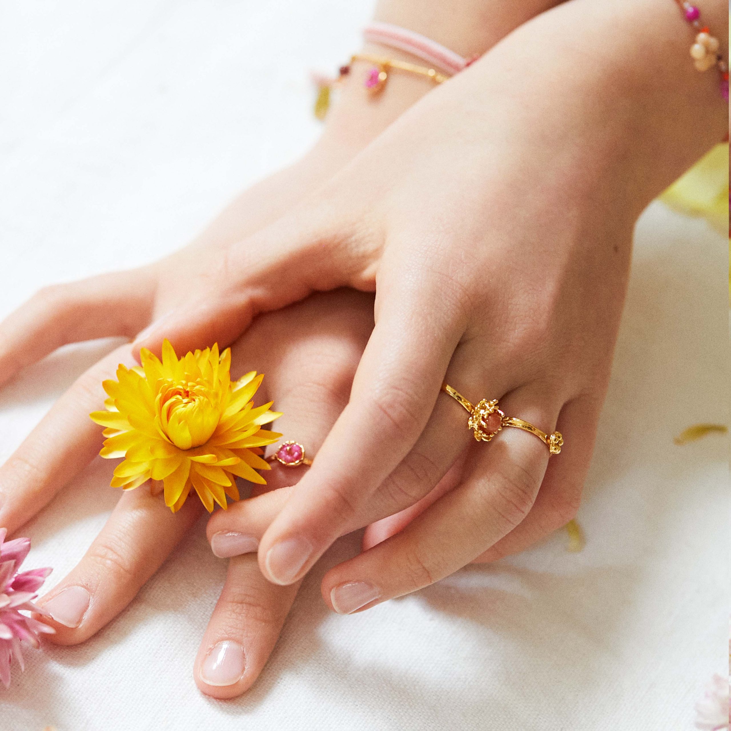 Grenadi est une bague réglable pour enfant, de 1,5 cm de diamètre, dorée à l’or 24 carats sur 3 microns sur une base en laiton, parsemée de perles de jade, grenat et nacre.