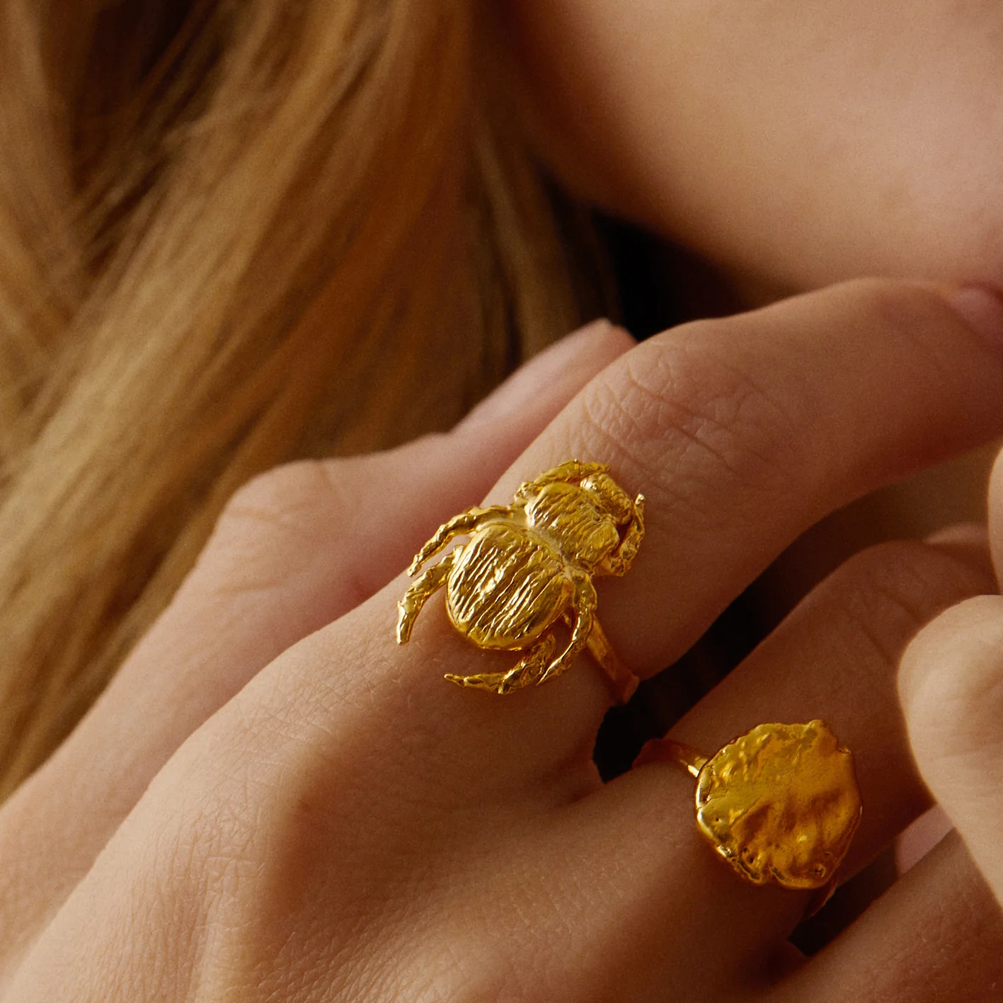 La bague ajustable Iepa, un travail minutieux fait-main, réalisé dans notre atelier parisien, est une pièce fine et martelée adaptable à tous les doigts, marquée d’un scarabée symbolisant la force intérieure grâce à sa carapace qui sert de protection et donne du courage. Une pièce sculpturale aux formes imparfaites à porter au quotidien tel un totem.