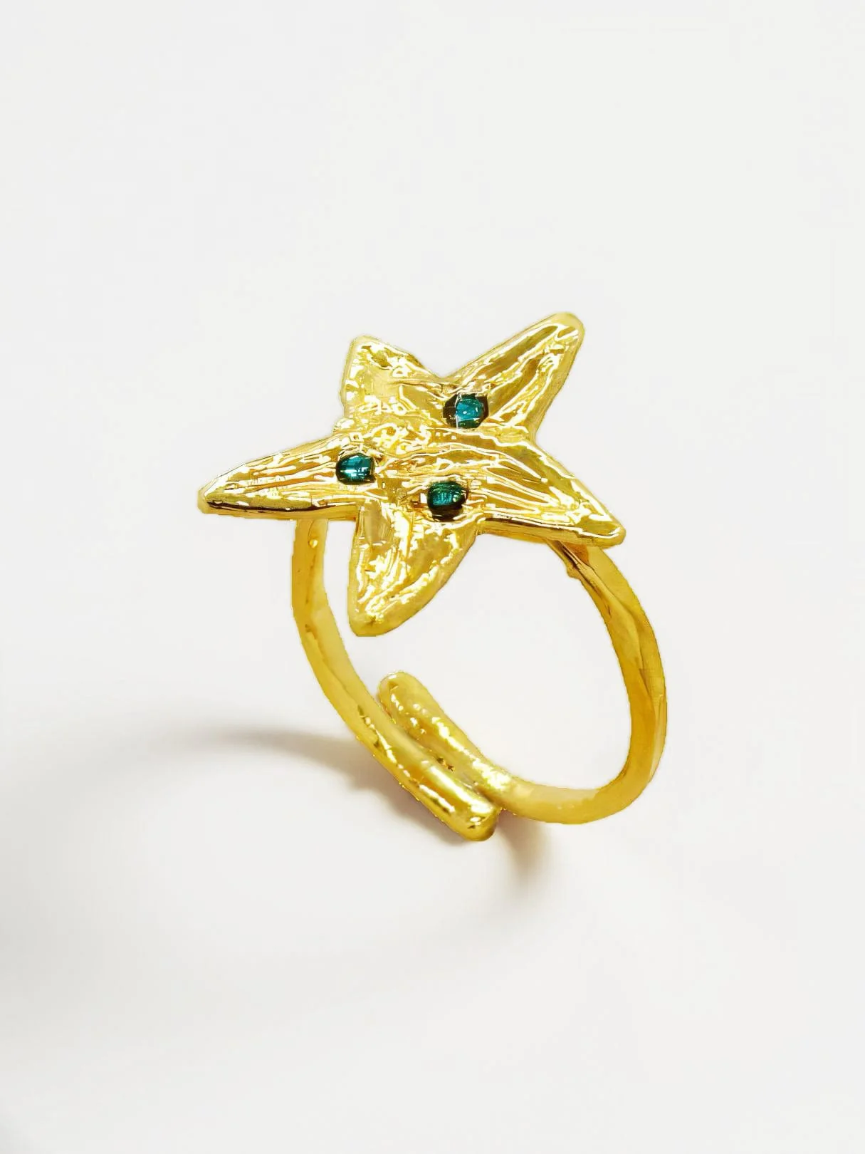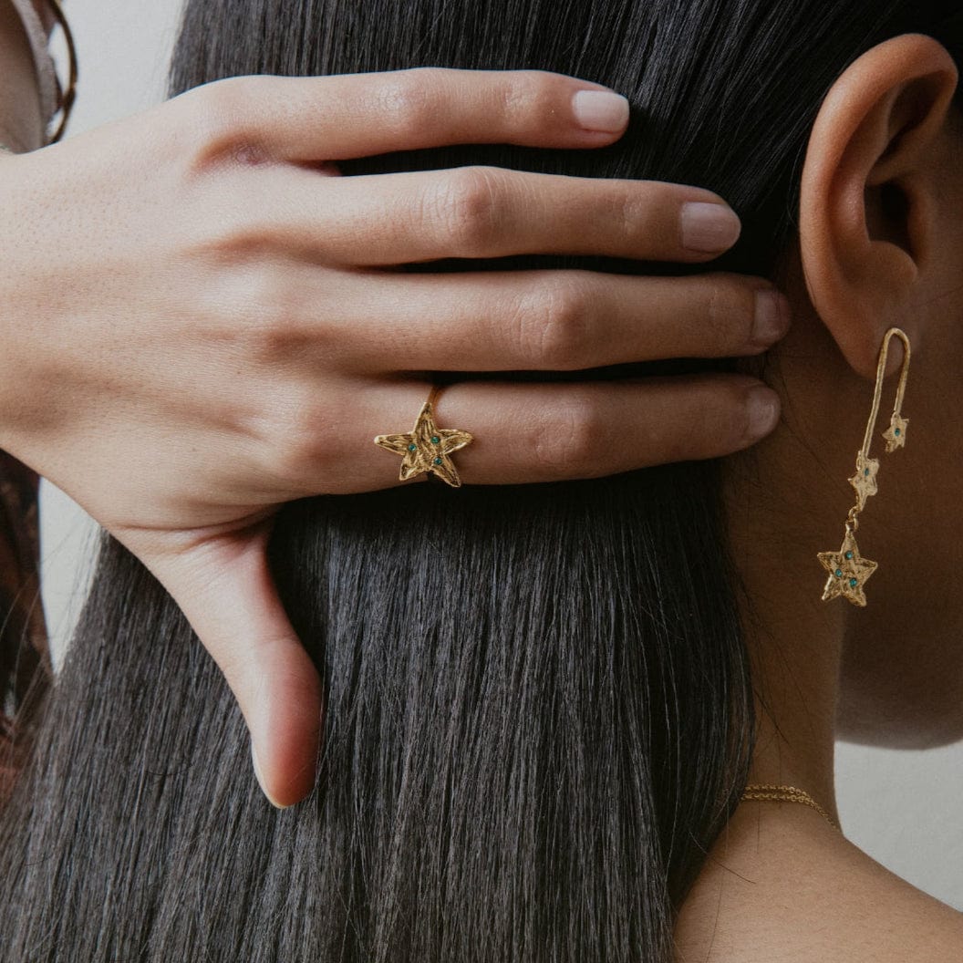 La bague Orla, fabriquée à Paris, allie finesse et éclat avec son étoile dorée et texturée. Ornée de cristaux, elle capte la lumière avec élégance. Un bijou délicat et raffiné pour sublimer chaque geste du quotidien.