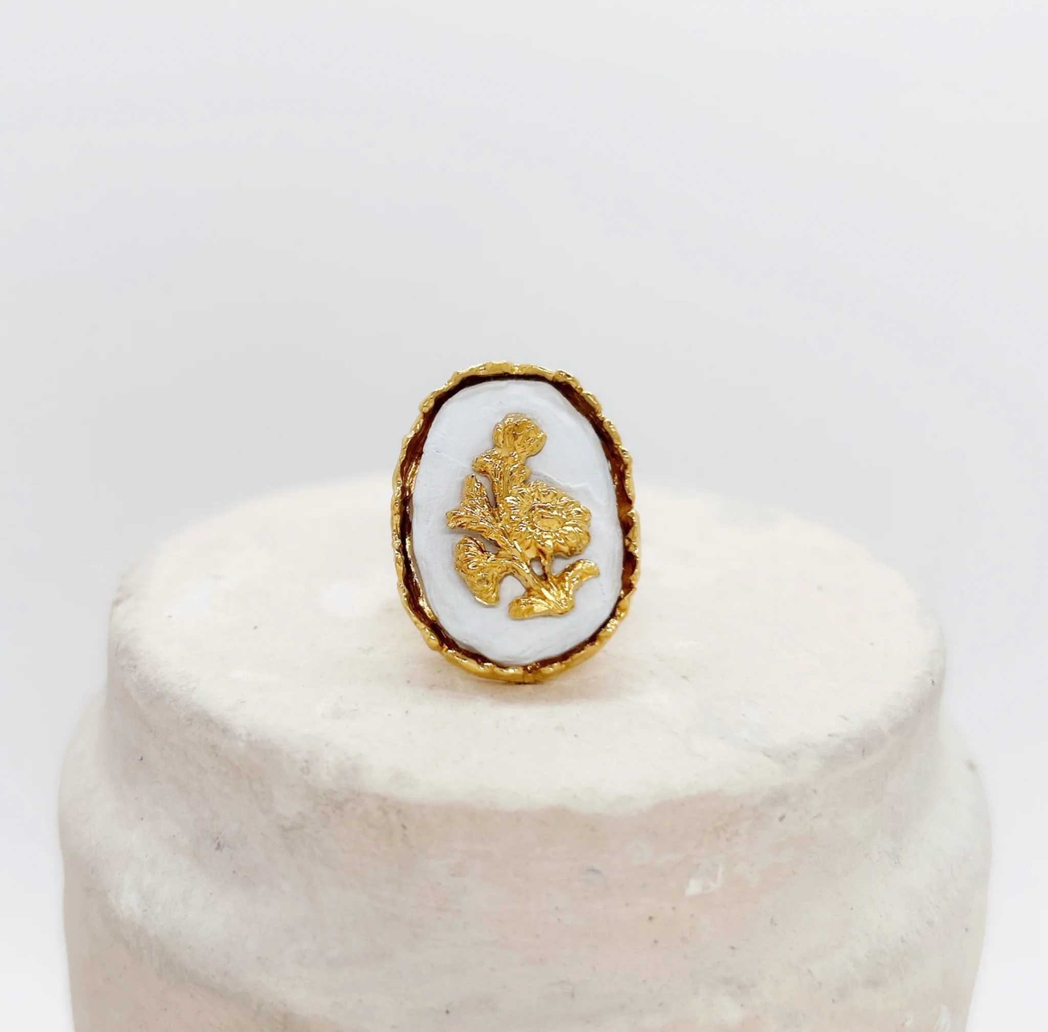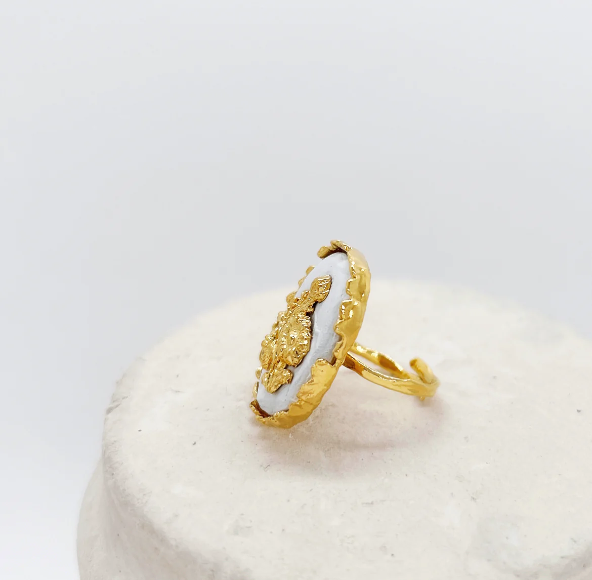 Une pièce forte fabriqué artisanalement à Paris, cette bague est ornée d’une céramique blanche réalisée à la main évoquant un univers antique qui rencontre l’éclat et la lumière d’une fleur dorée d’or 24 carats.