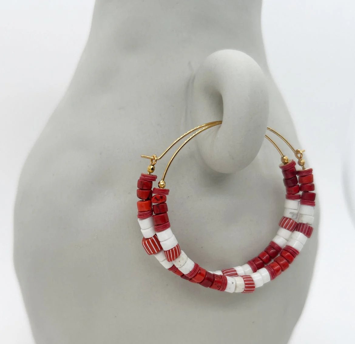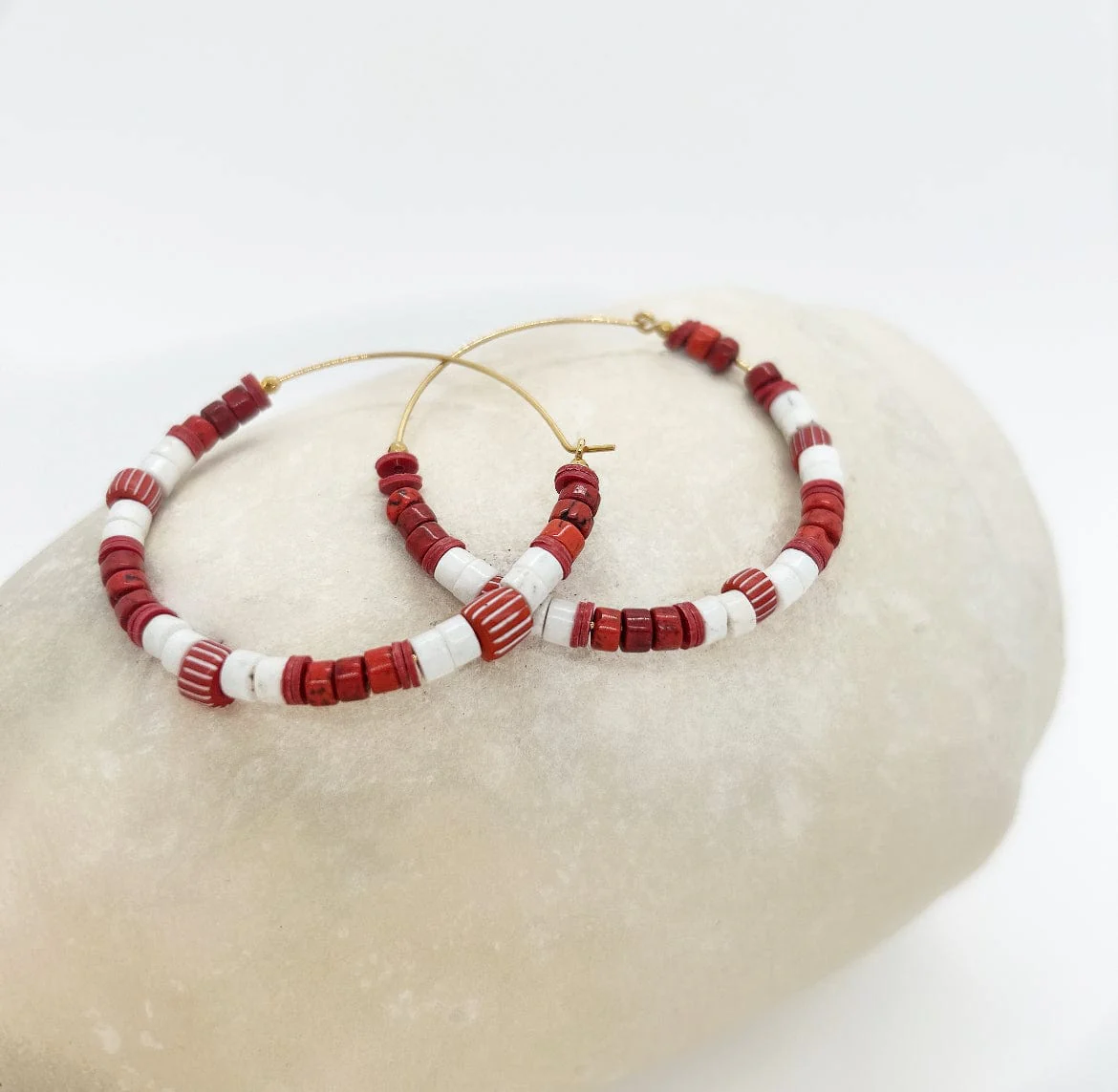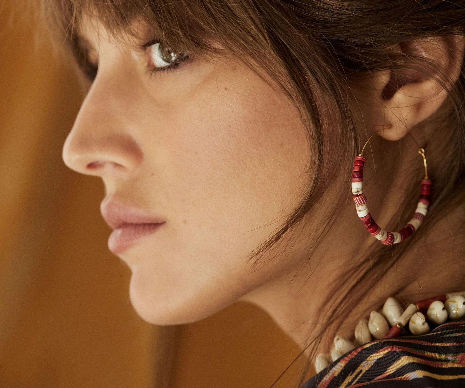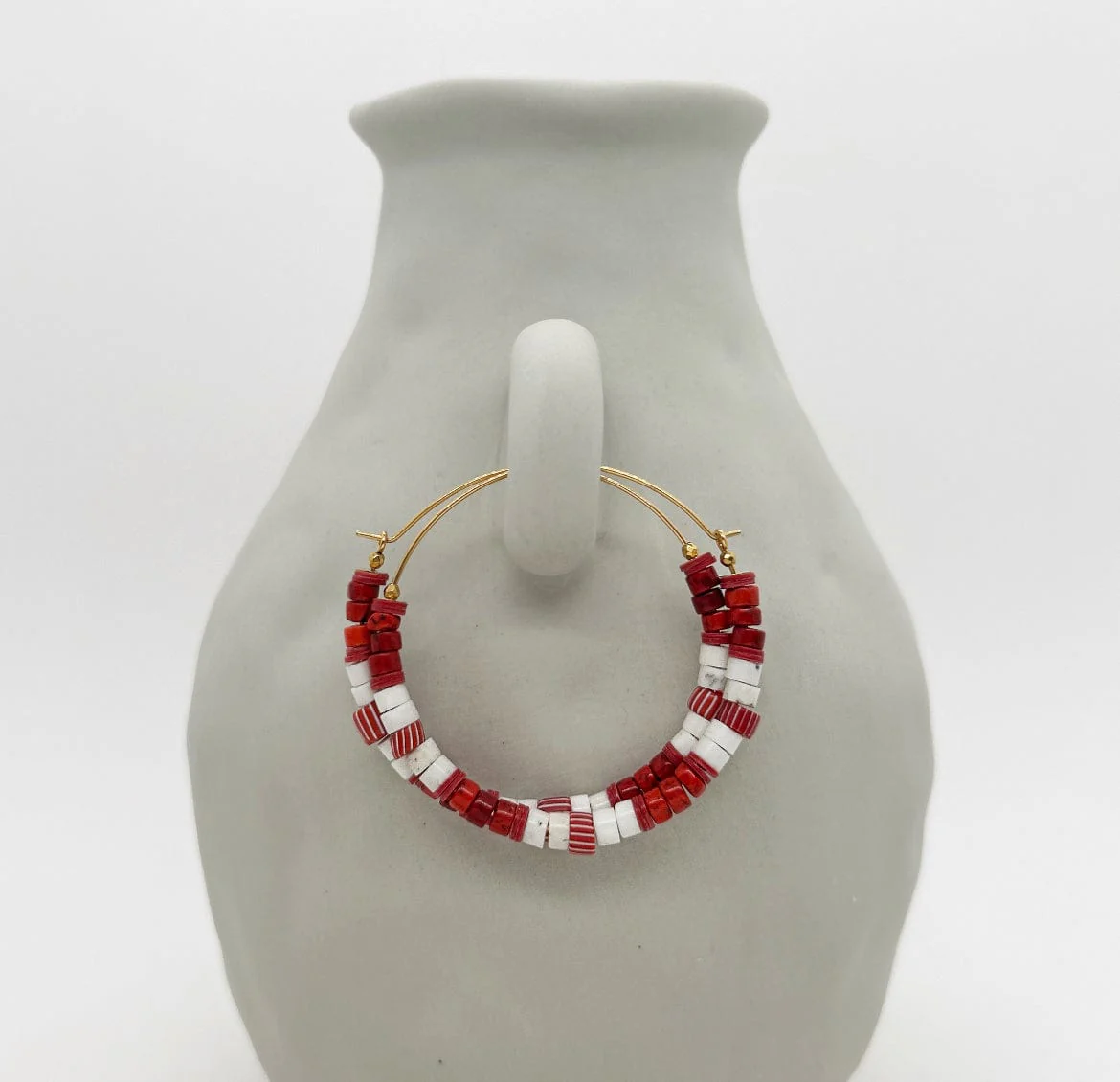 Nos créoles Canta pour oreilles percées sont réalisées à la main dans notre atelier parisien, avec un assortiment de perles en plastique recyclé et de perles naturelles, assemblées sur un fin anneau doré à l’or 24 carats.