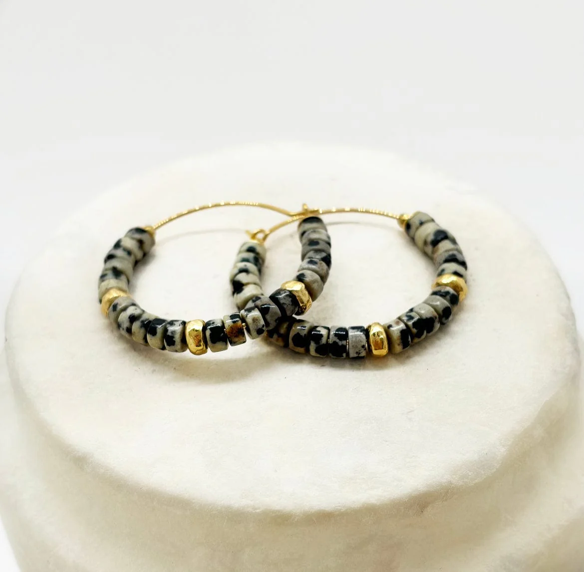 Découvrez les boucles créoles Cathy medium. Conçues à la main dans notre atelier Parisien, vous les avez aimées dans le cadre de l’octobre rose, vous allez les adorer dans ces merveilleuses pierres de Jaspes Dalmatien. Une pièce intemporelle qui vous suivra des années au quotidien.