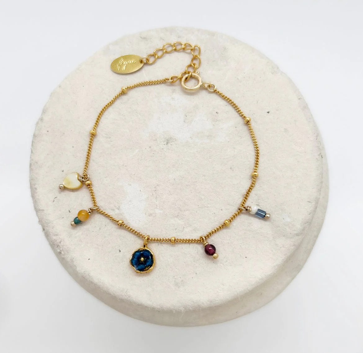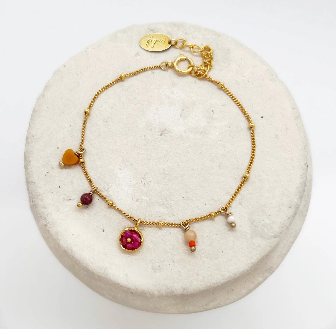 Cleo est un délicat bracelet ajustable doré à l’or 24 carats sur 3 microns sur une base laiton, parsemées de perles de Jade, Grenat et Nacre. Une pièce acidulée et poétique.
