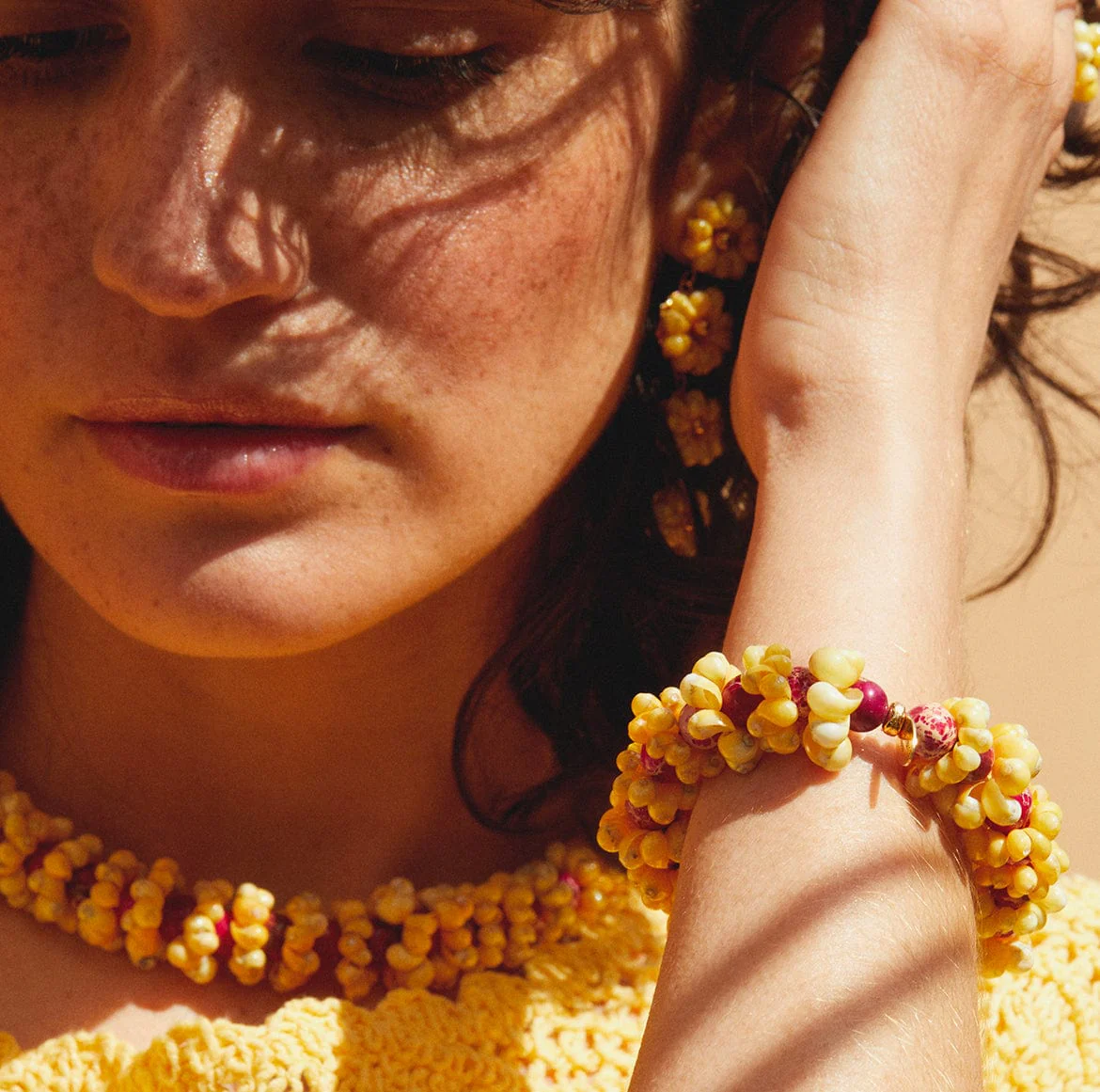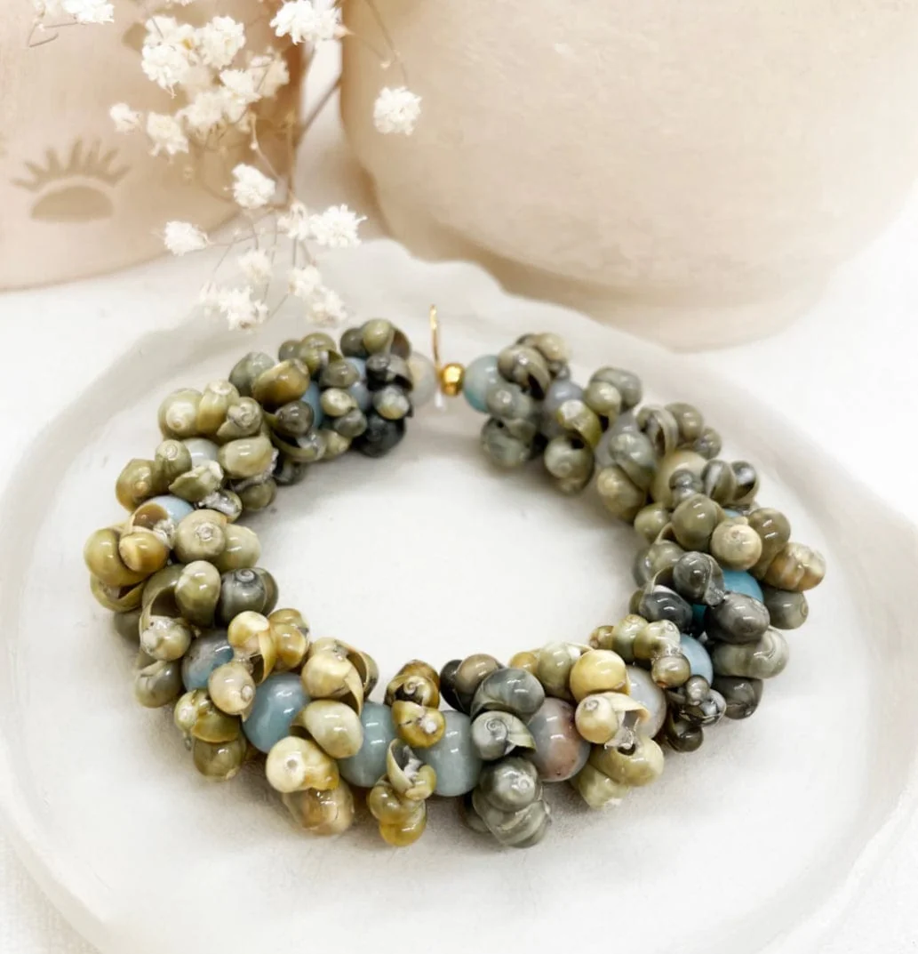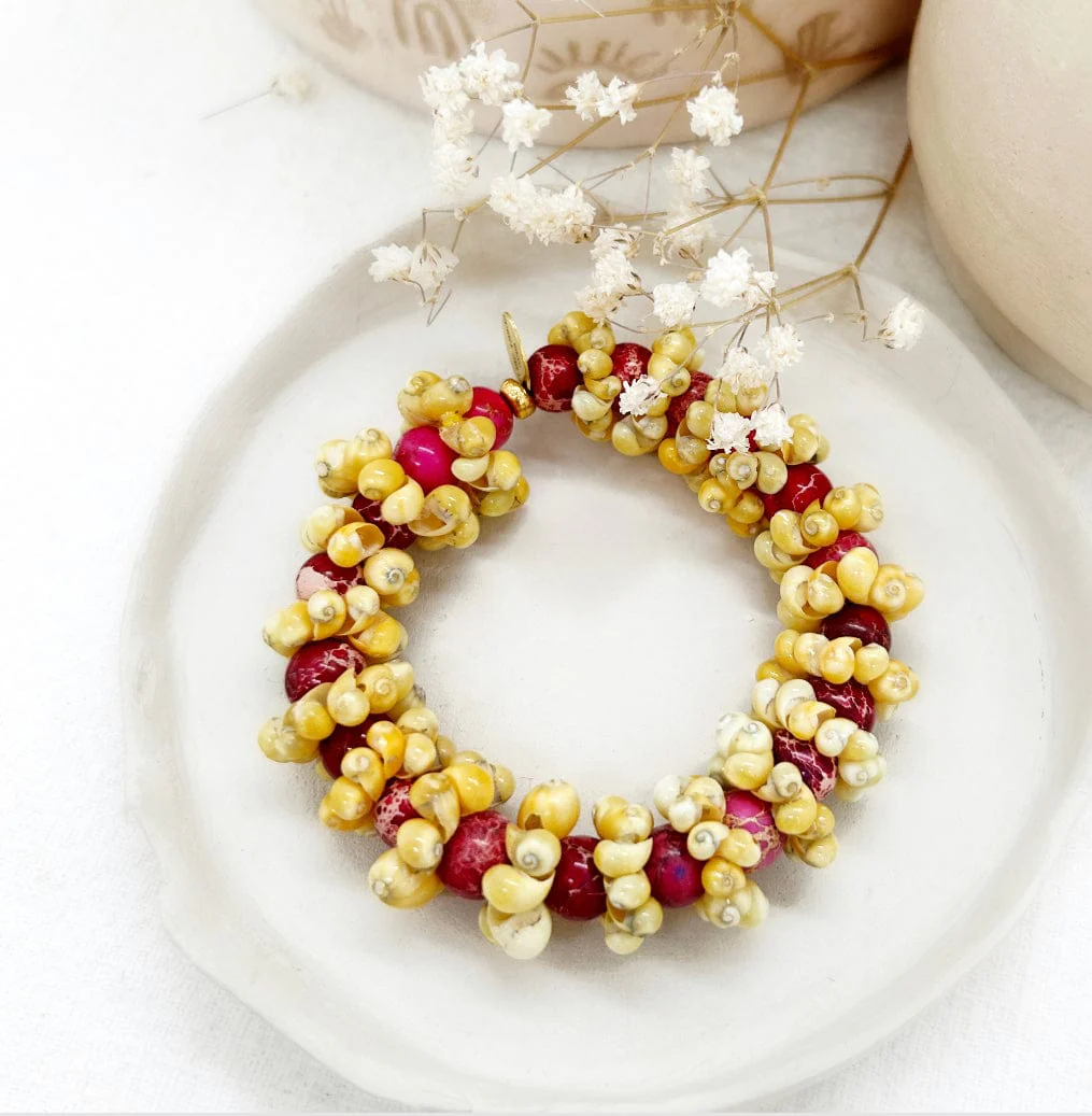 Disponible en plusieurs coloris et réalisé dans notre atelier parisien, le bracelet élastique Ermita apportera à vos poignets une audace estivale. Son alliance entre ses grandes perles simples bleues ou roses et ses couronnes de coquillages vertes ou jaunes apportera du soleil à vos tenues d’été.