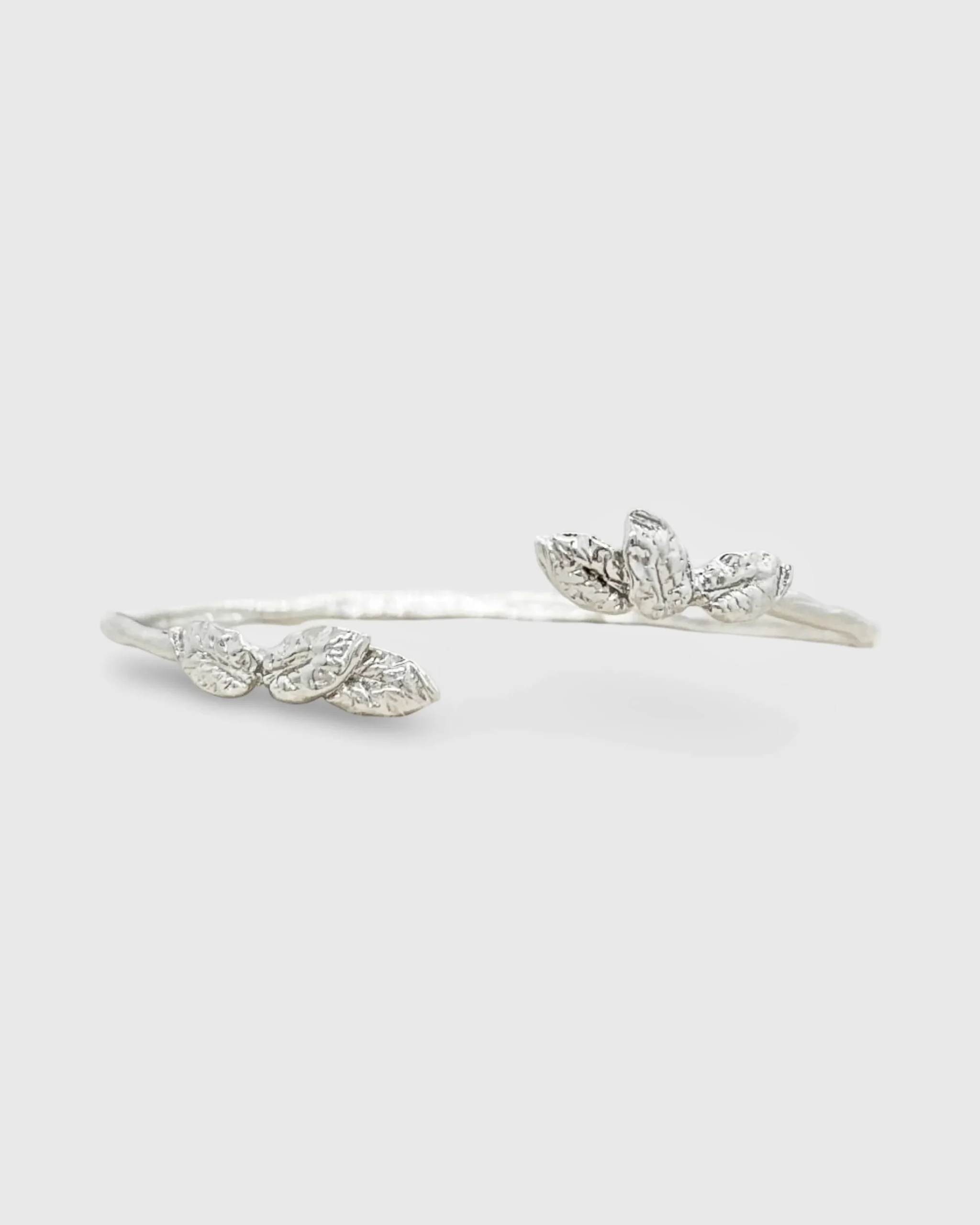 Fabriqué à la main en France, ce jonc ajustable est orné de délicates feuilles en accumulation. Un bijou iconique de notre maison. Facile à porter ce bracelet donnera un éclat subtil et un style romantique à toutes vos tenues.