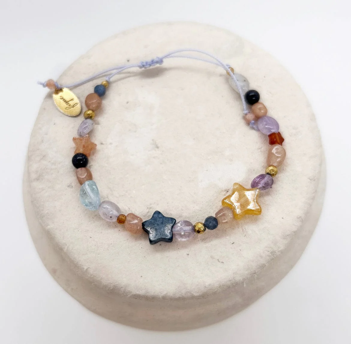 Bracelet Kosmos ajustable pour enfants. Mélange de perles de verre et de pierres naturelles sur son délicat et solide fil de lin. Une pièce aux douces couleurs d’été, qui nous renvoie directement dans nos rêves, bercé par les étoiles.