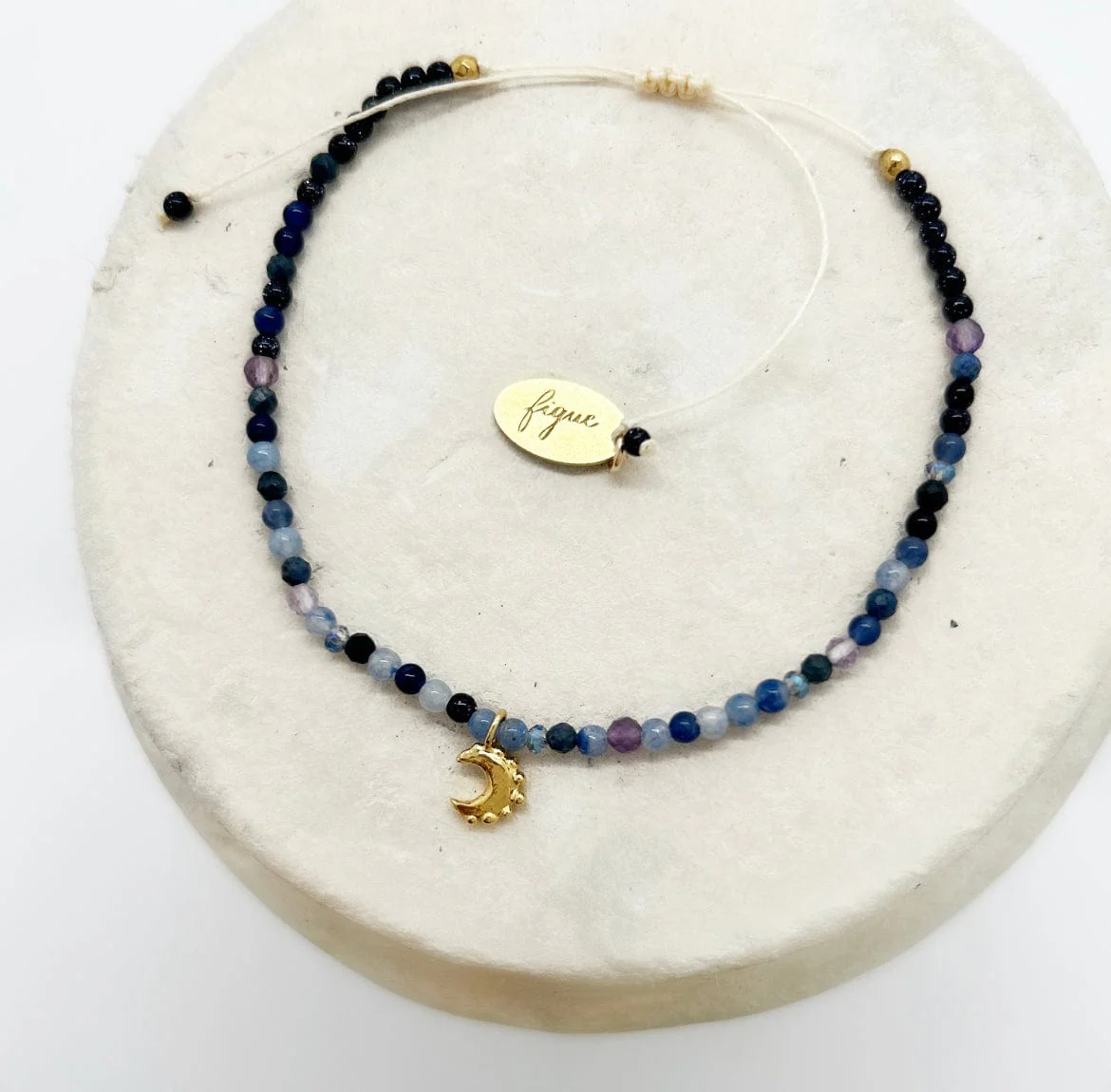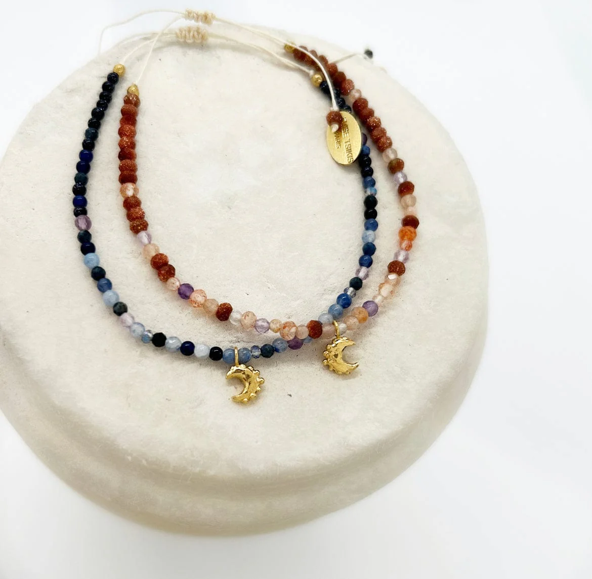 Le bracelet Salome est une pièce composée d’un mélange de perles semi-précieuses. Il est ornée d’une lune, symbole de poésie, de douceur et de lumière. Une association délicate et adorable de couleurs finement réalisée pour accompagner tout au long de l’année.