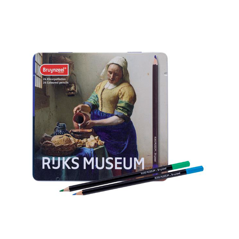Ce Coffret de couleurs de BRUYNZEEL contient 24 crayons de couleurs dans une boîte métallique qui rend hommage à Vermeet avec l’oeuvre intitulé “La Laitière”.