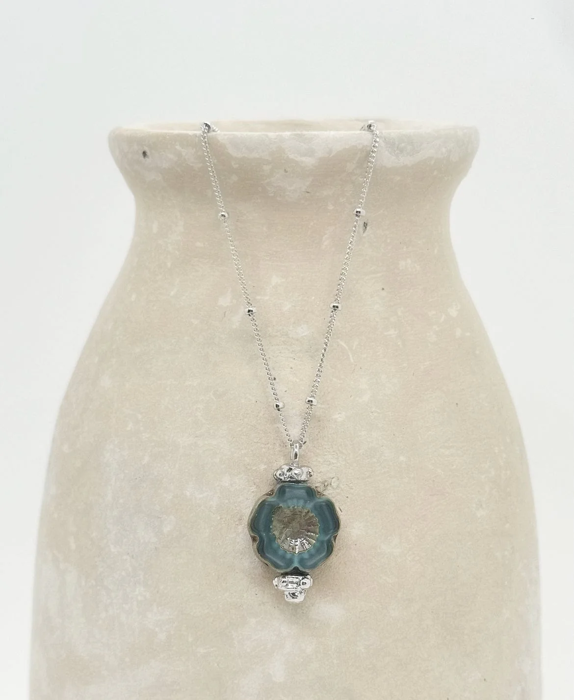 Fabriqué dans notre atelier à Paris, le collier Faro à la chaîne délicatement perlée et orné d’un pendentif en perle de verre gravé à la forme de fleur est parfait pour habiller vos tenues en toutes saisons.
