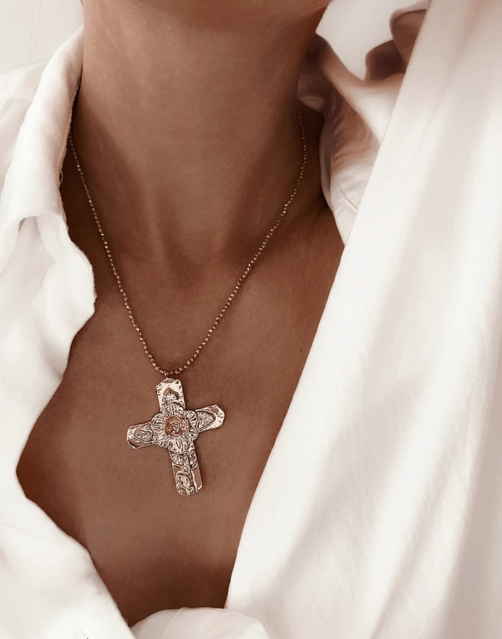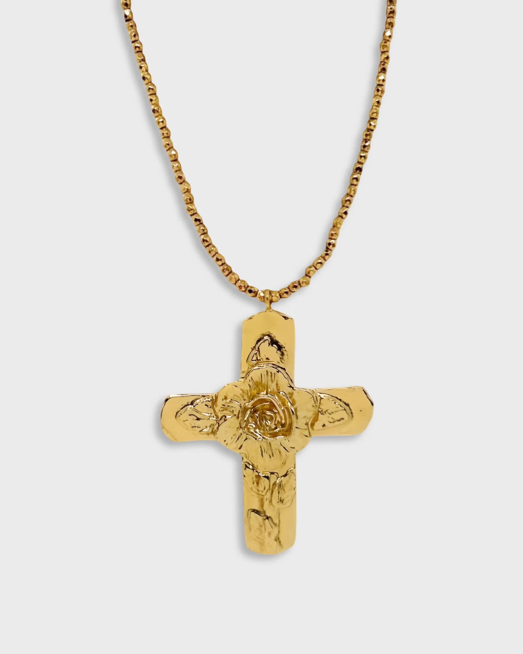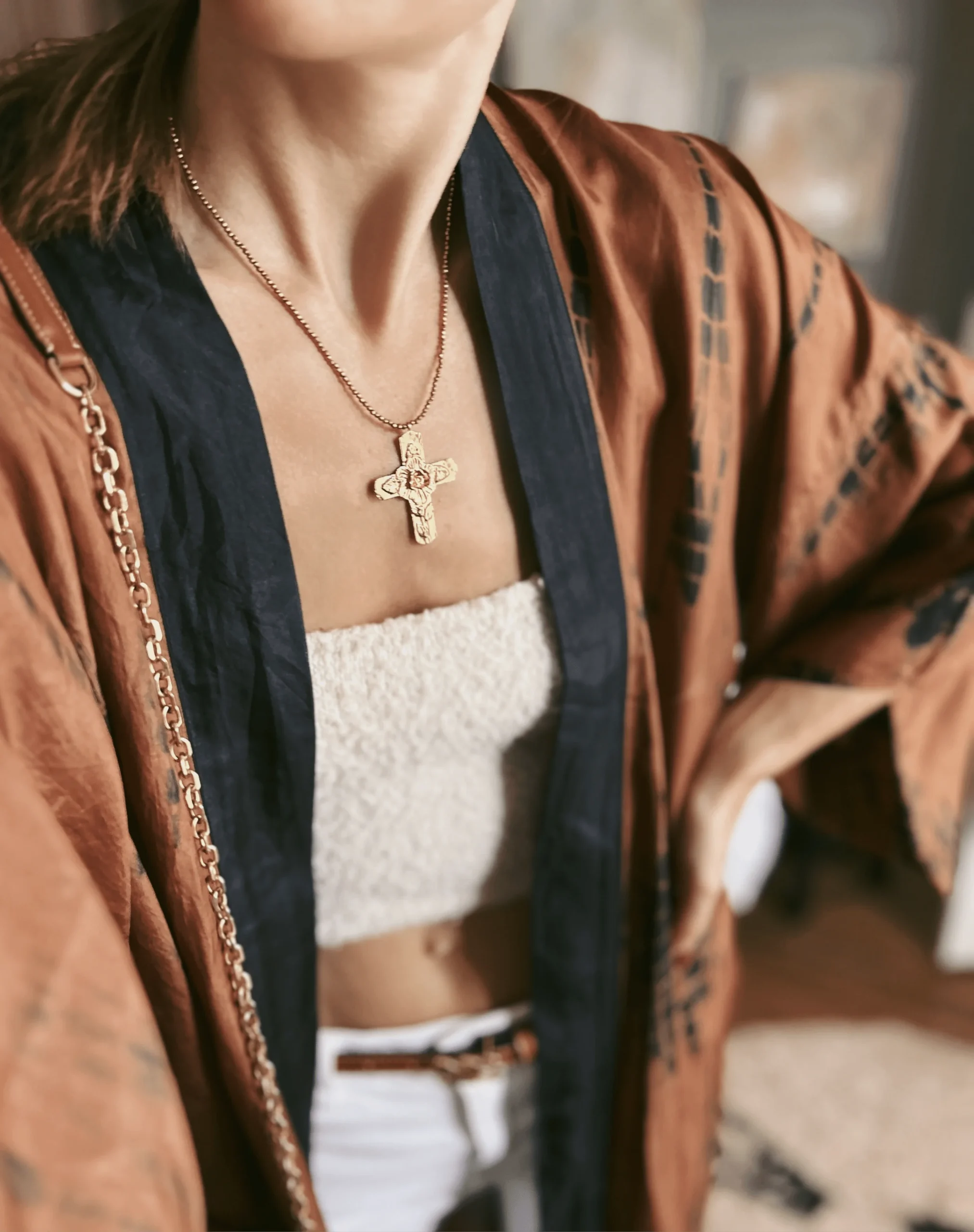 Le collier Itza rend hommage à l’artisanat mexicain et à sa spiritualité vibrante. Sa croix dorée à l’or recyclé 24 carats, sculptée à la main, rappelle les symboles sacrés que l’on retrouve dans les églises du Mexique. Au centre, une fleur en relief vient adoucir la force du symbole religieux, évoquant la richesse des autels fleuris et la poésie colorée des offrandes mexicaines. Entre force spirituelle et douceur artisanale, ce bijou incarne l’union du sacré et du solaire.