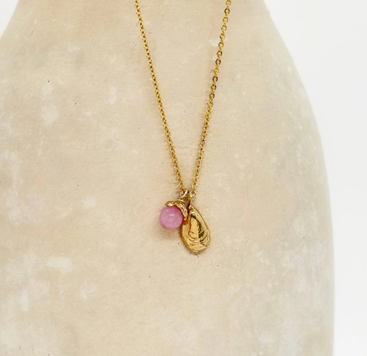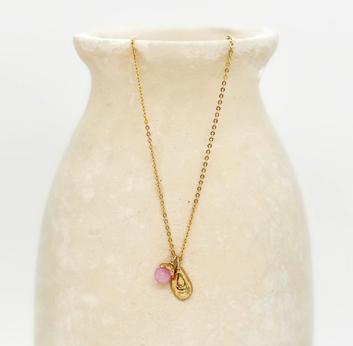 Réalisé avec soin dans notre atelier à Paris et doré à l’or recyclé 24 carats, notre collier Marina se compose d’une fine chaîne à mailles forçat et de deux petites breloques : une délicate perle de Jade rose, et un joli coquillage. Raffiné et discret, Marina est le premier collier idéal.