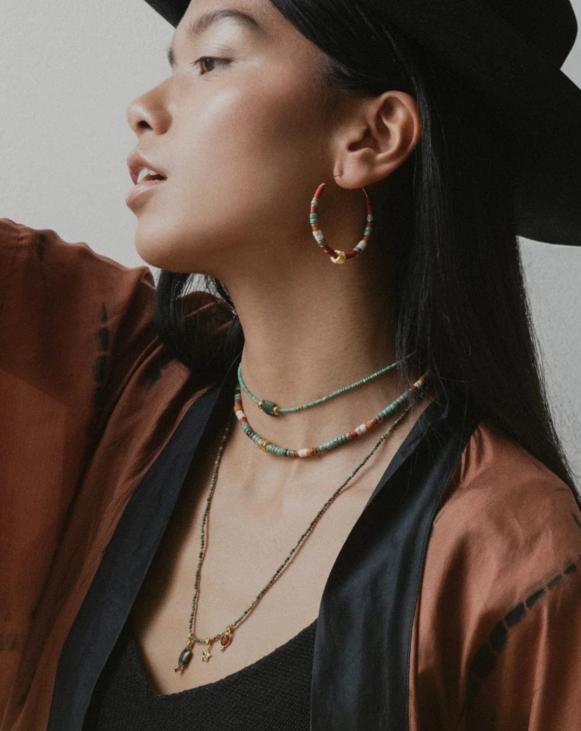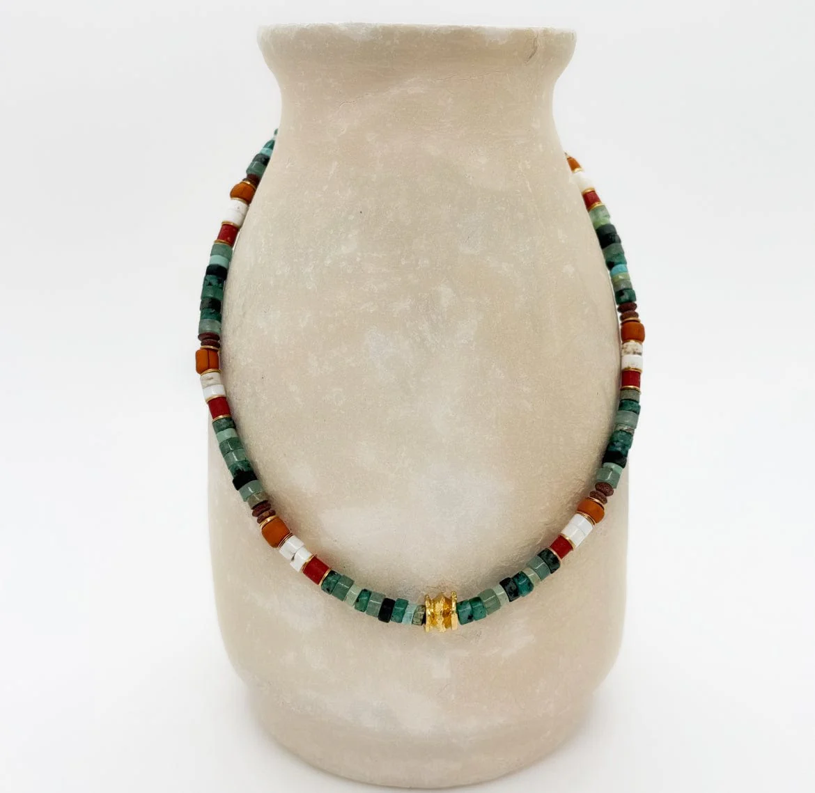 Le collier Meada mêle avec élégance des perles naturelles aux nuances terreuses, rappelant la richesse des paysages minéraux. Assemblé à la main dans nos ateliers parisiens, chaque détail reflète un savoir-faire artisanal d’exception. Rehaussé de touches dorées, ce bijou incarne un équilibre parfait entre authenticité et raffinement.