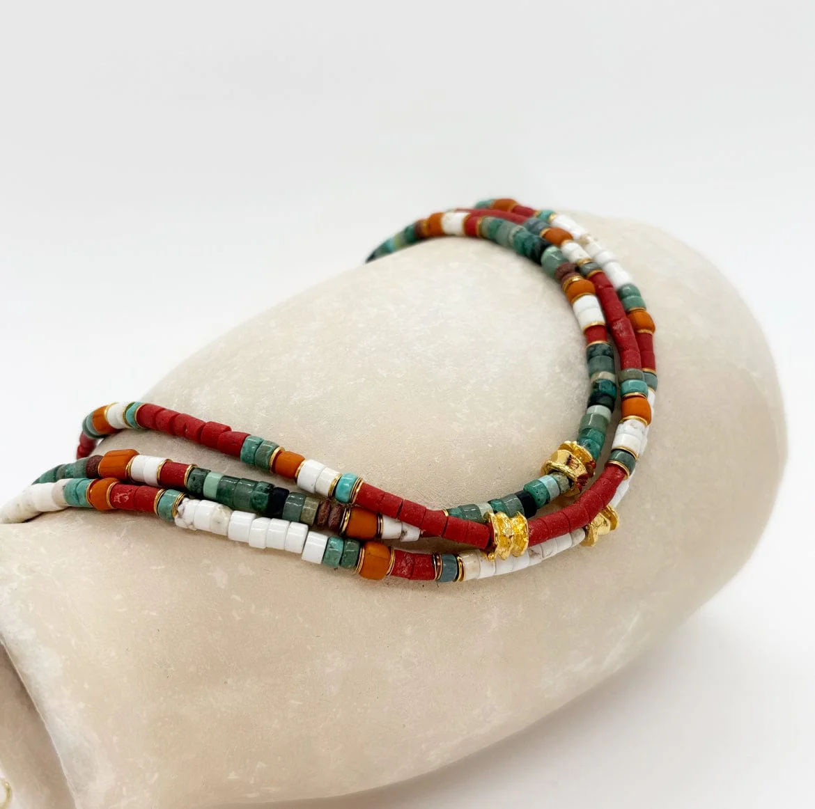- Pierres naturelles : Howlite blanche, Aventurine verte, Jaspe rouge.