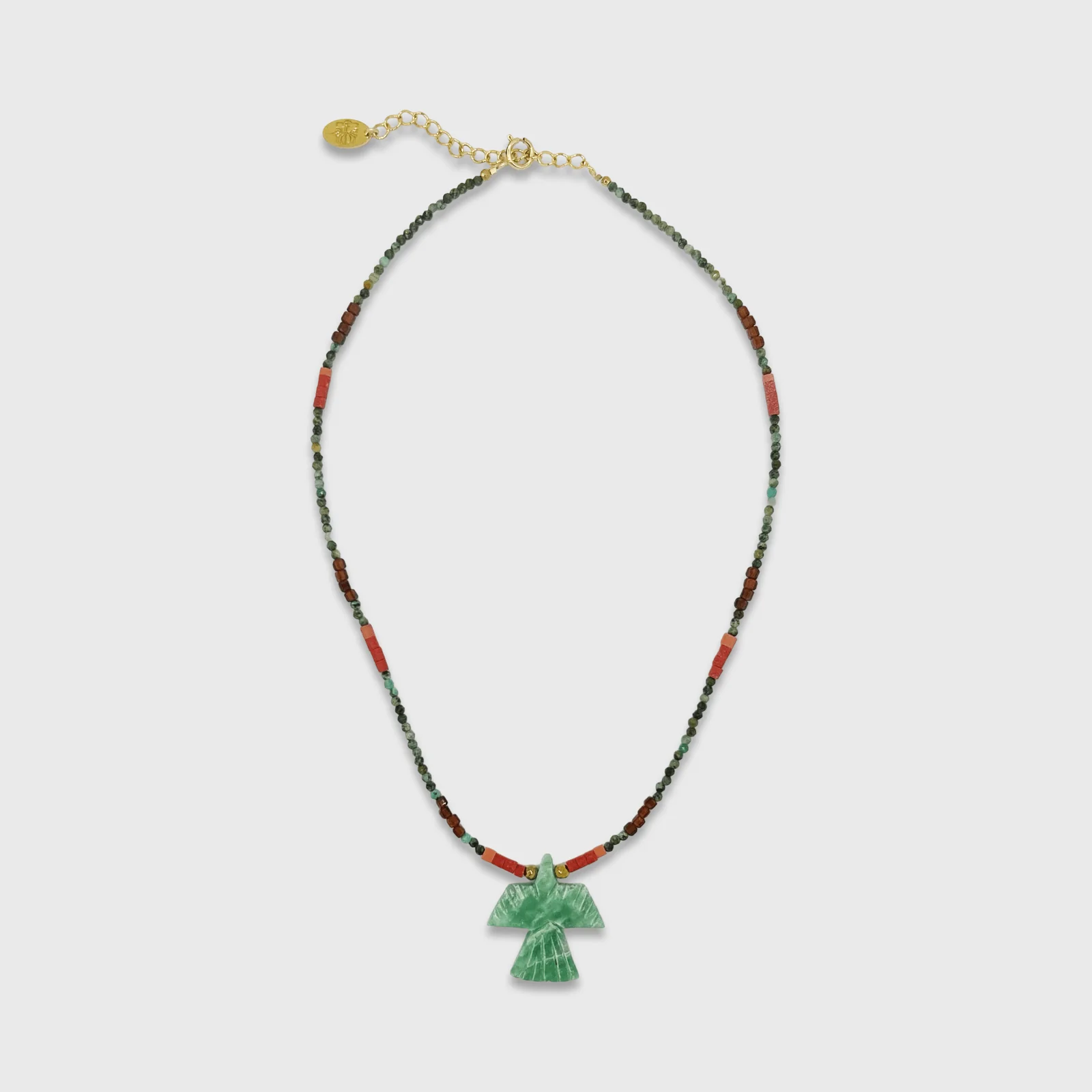 Le collier Millea, fabriqué à Paris, est composé de perles naturelles aux nuances terreuses et d’un pendentif sculpté en pierre Aventurine naturelle. Chaque élément a été soigneusement assemblé à la main dans un atelier artisanal. Son design unique évoque l’harmonie entre nature et savoir-faire d’exception.