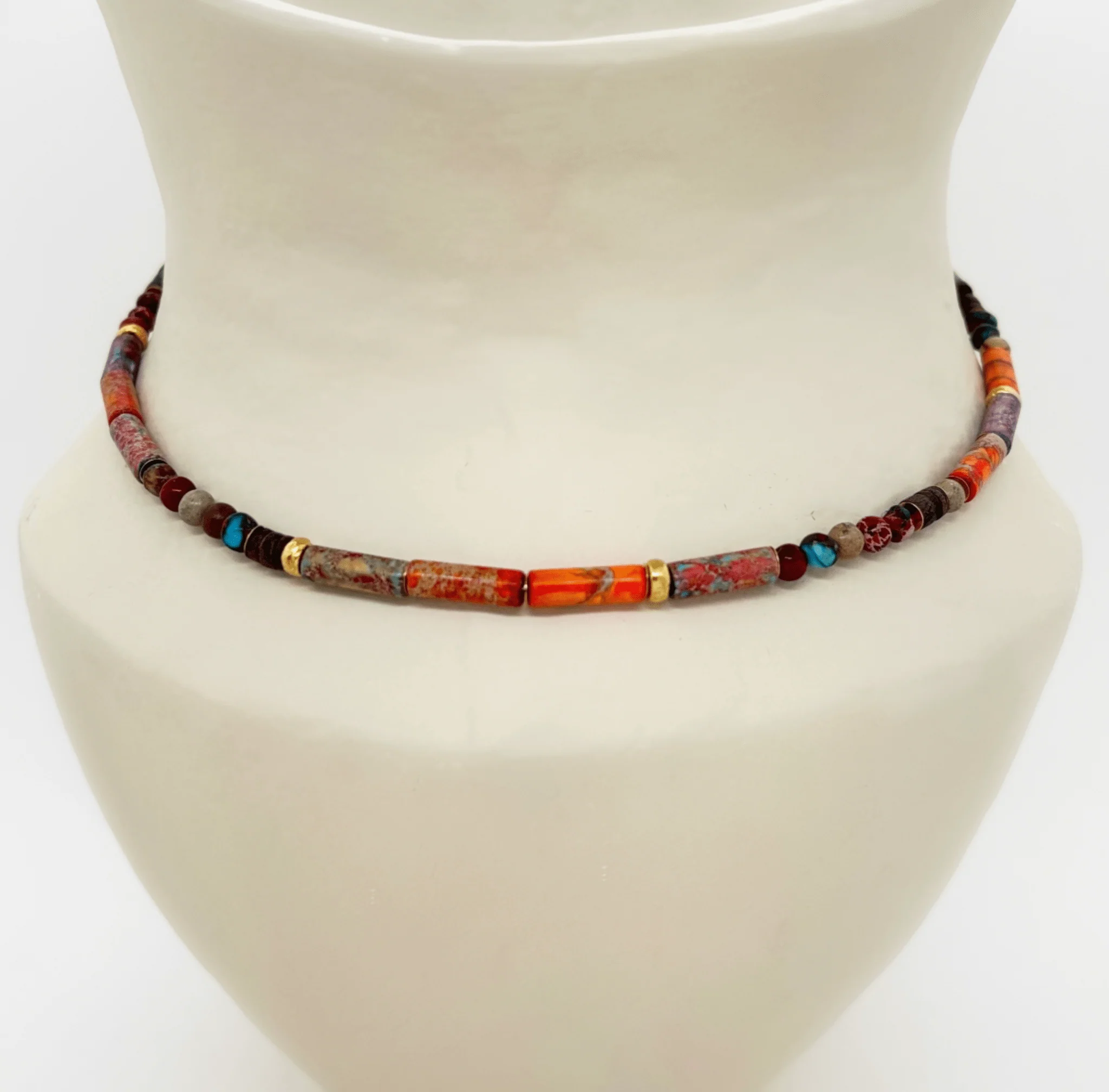 Une belle robe, une jupe ou un pantalon, le collier perlé ras du coup Romeo ajoutera un style ethnique et coloré à toutes vos tenues du quotidien grâce à ses pierres naturelles de jaspes impériales.