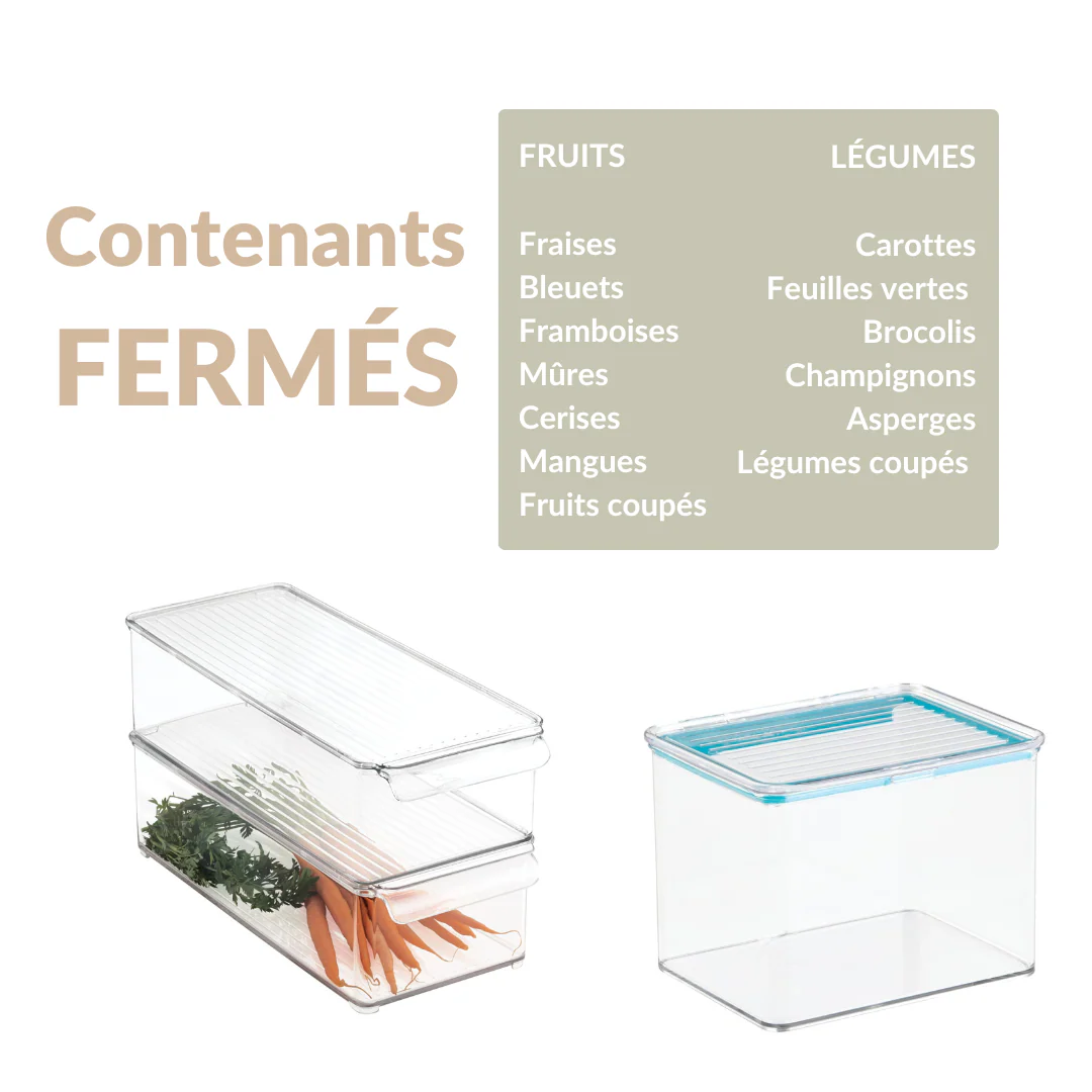 Les contenants Margot sont conçus pour prolonger la durée de vie de vos aliments au réfrigérateur. Grâce à leur système hermétique, ils conservent la fraîcheur, la texture et la saveur de vos fruits, légumes et autres aliments périssables. Étanches et empilables, ils sont parfaits pour éviter le gaspillage alimentaire tout en optimisant l’espace dans votre frigo.