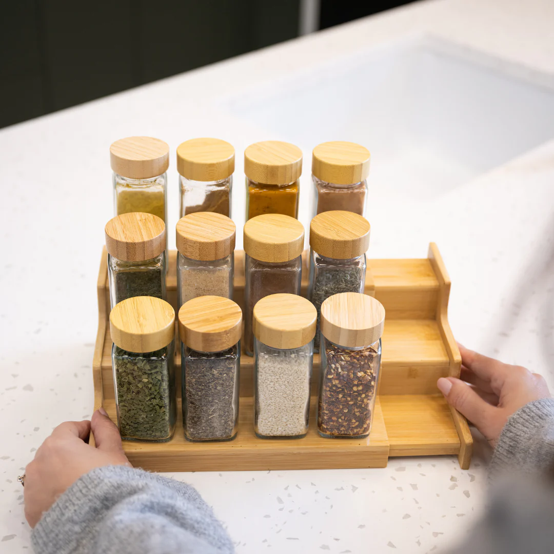 Rangements optimisés : placez vos pots à épice côte-à-côte sur trois niveaux, pour un accès facile et une vue d’ensemble.