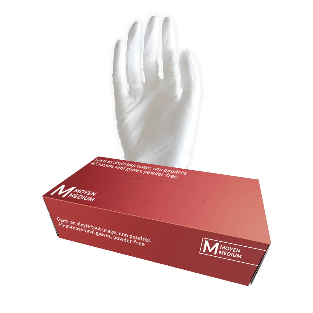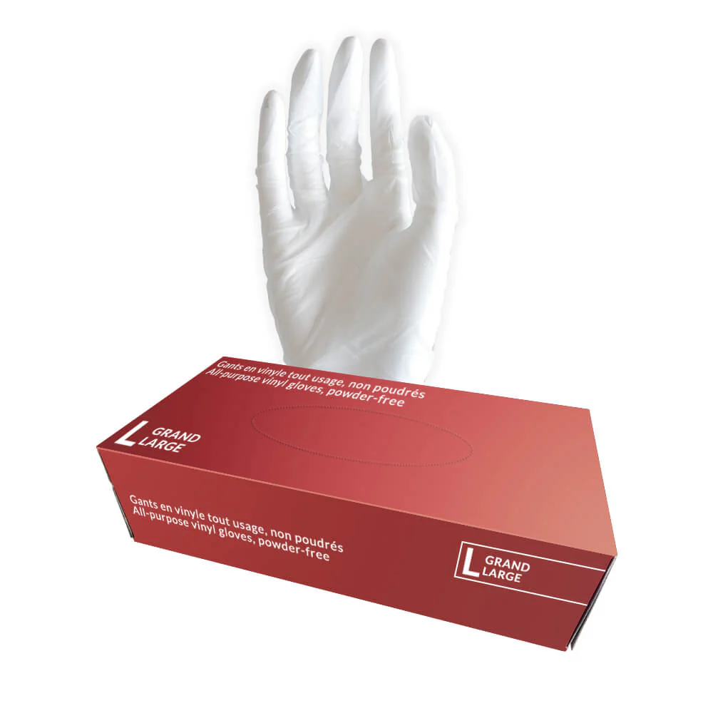 Gants de vinyle tout usage en boîte de 100, avec bord roulés et non stériles. Les gants tout usage sont conçus pour être résistant et durable, pour usage non médical. Non approuvé par Santé Canada.