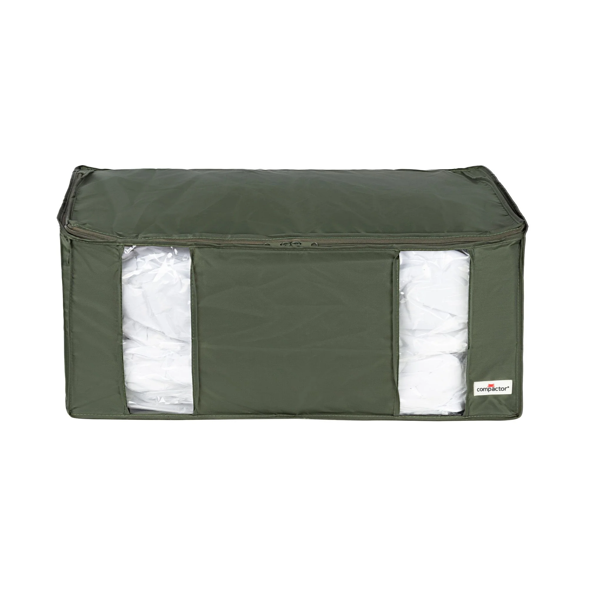 La housse extérieure de couleur kaki est fabriquée en RPET, matériau 100% à base de bouteilles plastique recyclées qui en fait une housse 100% recyclable. Elle est équipée de deux poignées de transport et de fenêtres en transparentes qui permettent d’identifier aisément le contenu. Le sac intérieur est équipé d’un double zip avec curseur de fermeture et d’une valve exclusive brevetée qui empêche le retour de l’air : ce dispositif évite au sac de se regonfler une fois qu’il est compressé. La valve s’adapte avec tout aspirateur muni d’un tuyau flexible. Votre linge sera protégé de la poussière, des mites, acariens et de l’humidité.