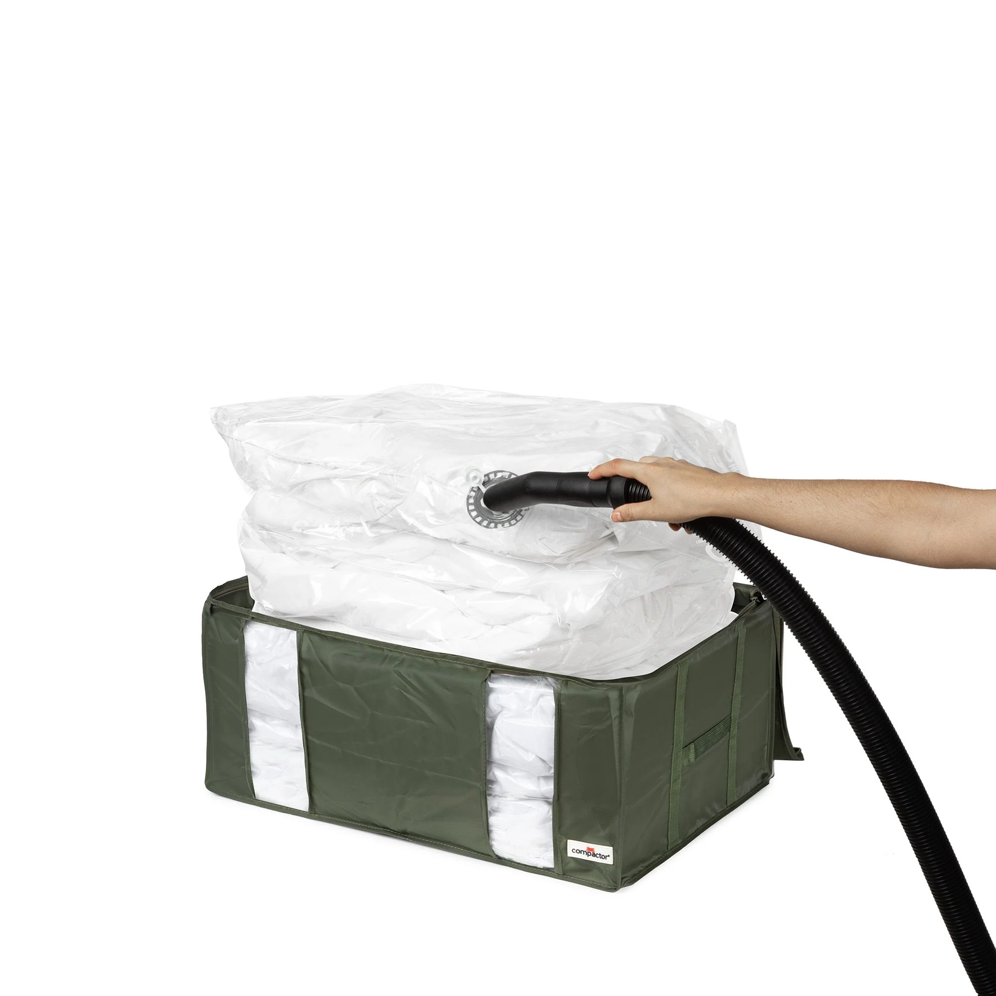 - Compression facile et instantanée avec tout aspirateur muni d’un tuyau flexible