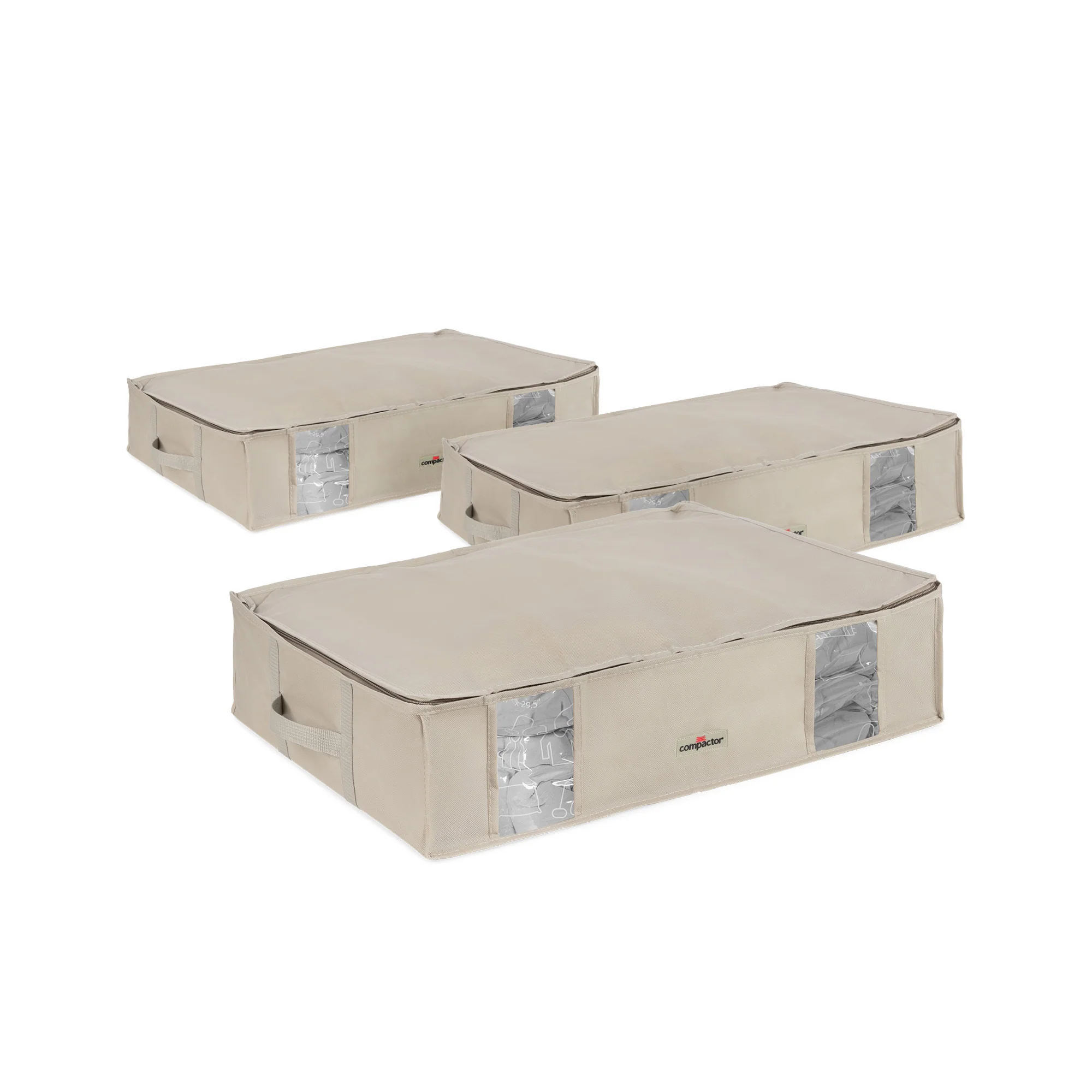 Leur format extra-plat permet de les ranger facilement sous un lit. Chaque housse est équipée de deux poignées solides pour un transport pratique, et de fenêtres transparentes pour visualiser immédiatement le contenu.