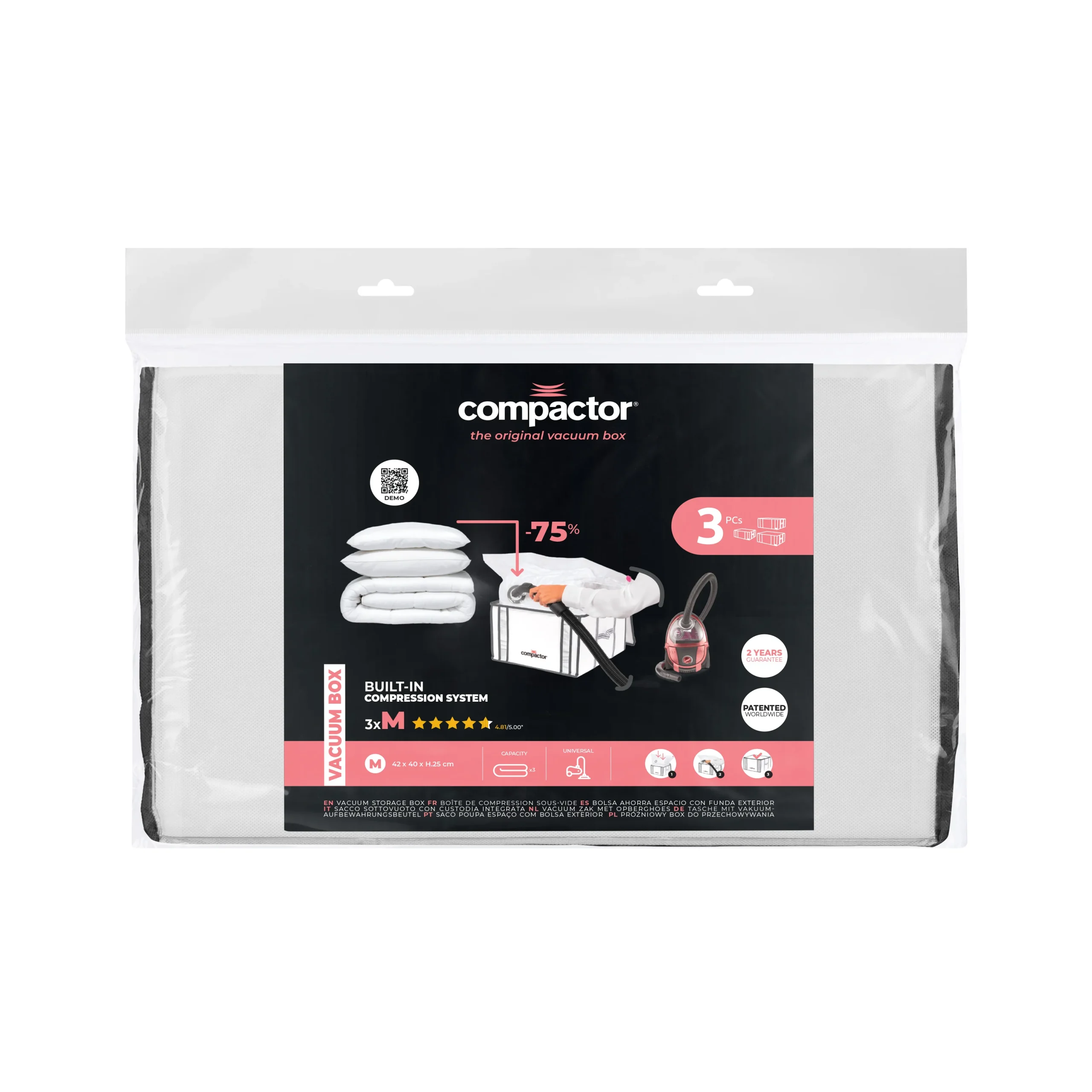 Grâce à la technologie brevetée Compactor, bénéficiez d’une mise sous vide 30 % plus rapide via une valve ultra-performante, d’un sac 30 % plus épais pour plus de résistance. Optimisez votre espace avec ce lot de 3 housses de rangement sous vide Compactor de taille M. Grace leurs dimensions (42 x 40 x H.25 cm) chaque housse vous permet de stocker l’équivalent d’une couette 2 personnes soit un volume important tout en réduisant son encombrement jusqu’à 75 %.