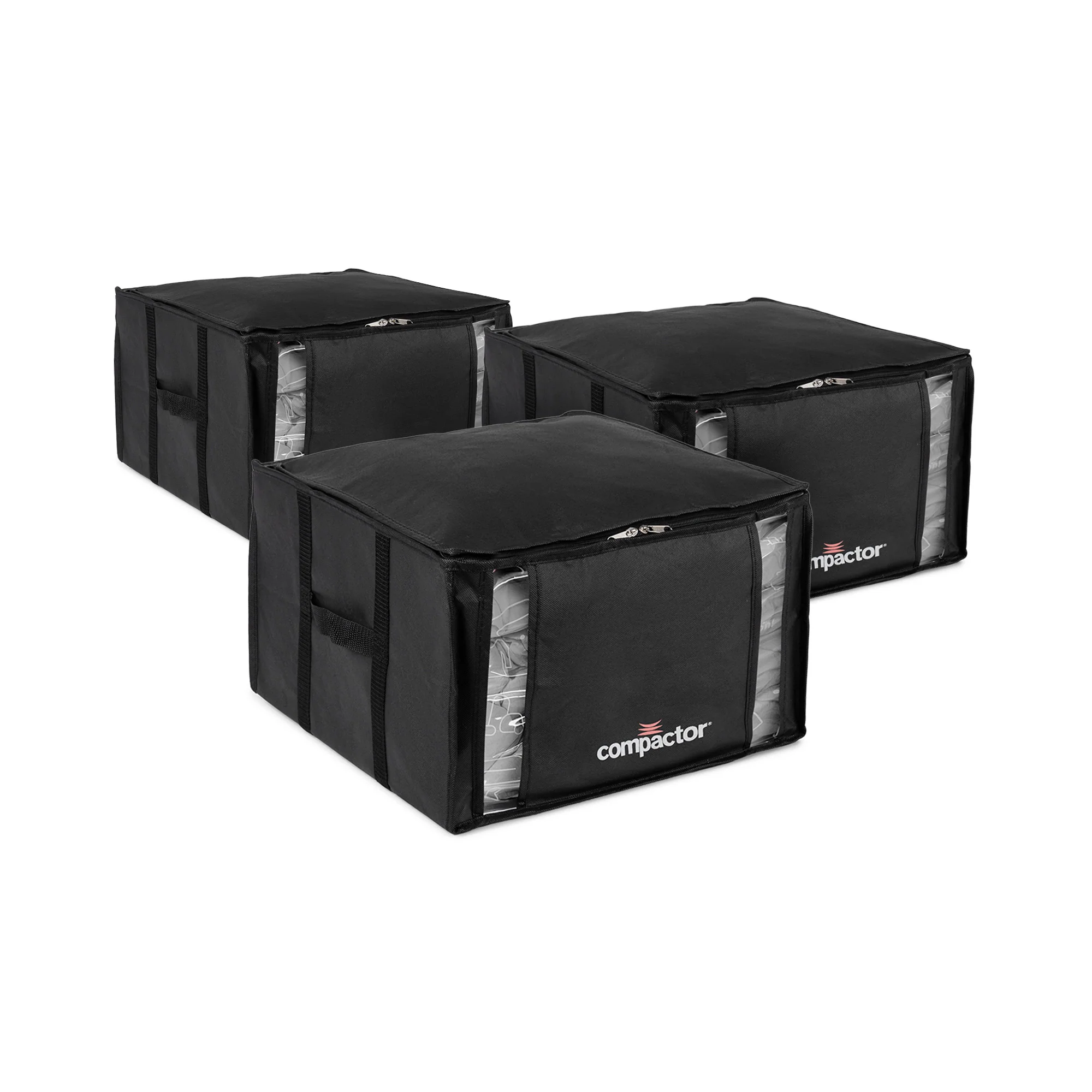 La housse extérieure est fabriquée en polypropylène (100 %), le sac de compression en PE (14 %), PET (83 %), silicone (3 %).Chaque housse est équipée de deux poignées solides pour faciliter le transport, ainsi que deux fenêtres transparentes pour visualiser immédiatement le contenu. Le sac intérieur dispose d’un double zip avec curseur et d’une valve universelle anti-retour qui empêche le sac de se regonfler une fois compressé. Un mode d’emploi est imprimé directement sur le sac pour une utilisation simplifiée.