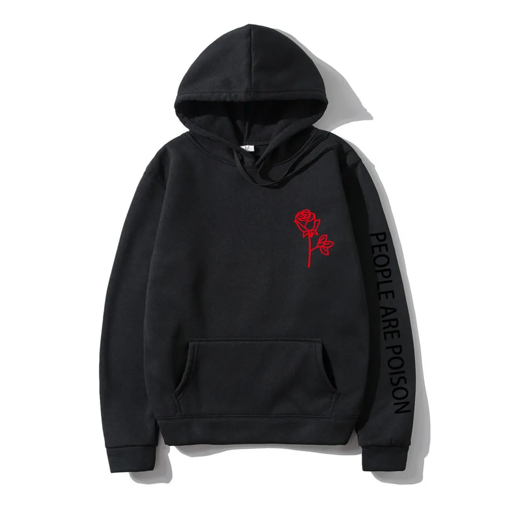 A great hoodie for the lady who has a little bad girl in her. Wear your LUNOAKVO People Are Poison Hoodie under a leather jacket or a sleeveless jean jacket. Super soft, thick cotton will keep you warm. The high neckline has a drawstring closure if it gets chilly. The front is accented with an embroidered rose on the chest and the sleeve with small lettering that give it a little edginess. The perfect hoodie to wear riding the motorcycle or to a heavy metal concert.