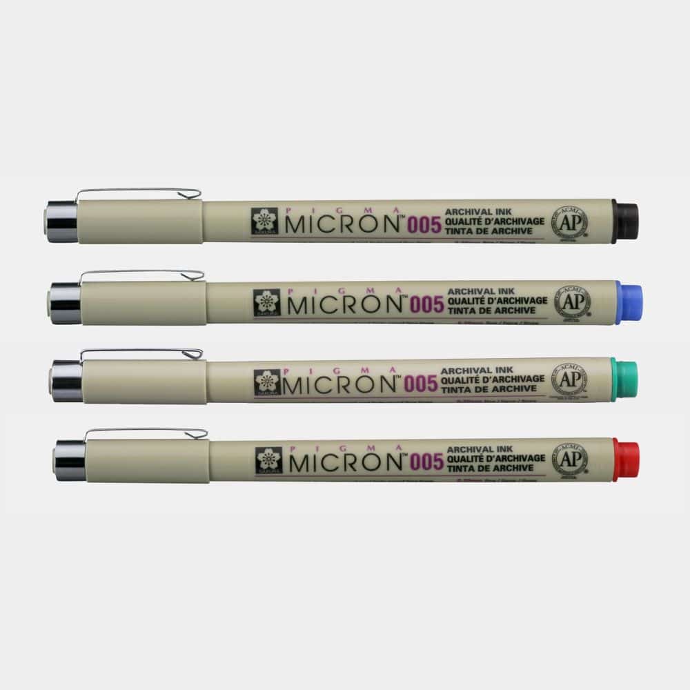 Ces feutres techniques finement calibrés utilisent une encre à base de pigments et d’eau : Feutre Pigma Micron de SAKURA.