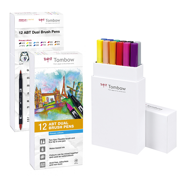 – La Pochette Couleurs primaires contient 12 ABT Dual Brush Pens: N15 Noir, 055 Jaune process, 476 Cyan, 676 Violet royal, 845 Carmin, 879 Marron, N75 Gris froid 3, 296 Vert, 555 Outremer, 725 Rouge rhodamine, 873 Corail et 933 Orange.